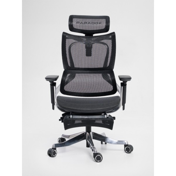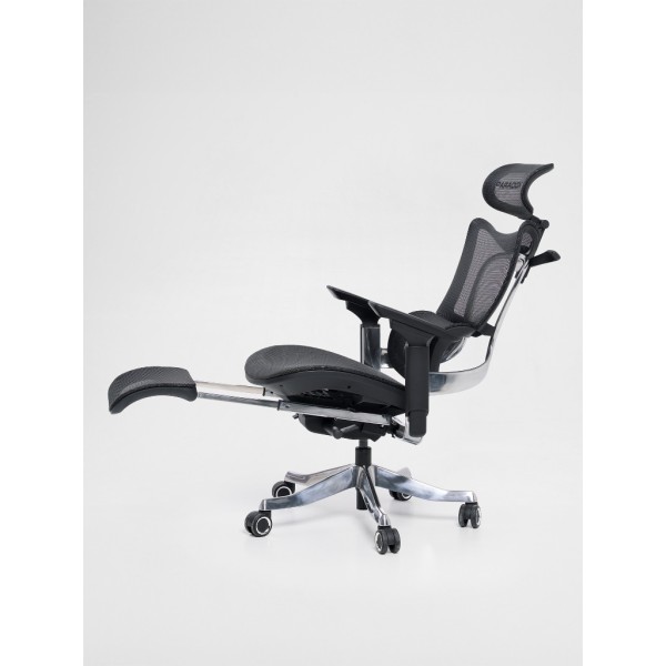 Model ten wyróżnia się zintegrowanym, wysuwanym podnóżkiem (do 44 cm). W połączeniu z odchyleniem oparcia do 135 stopni, fotel umożliwia przyjęcie pozycji regeneracyjnej w trakcie przerwy. Za komfort górnych partii ciała odpowiada **zagłówek 3D** oraz miękkie **podłokietniki 5D** z nakładką PU, które redukują napięcie w barkach i karku.