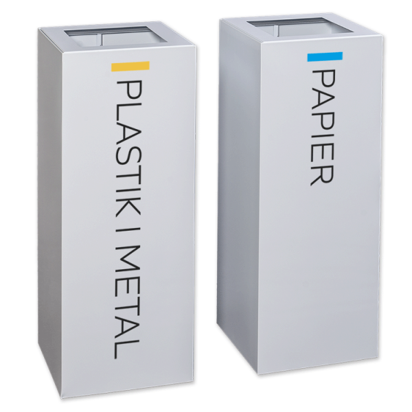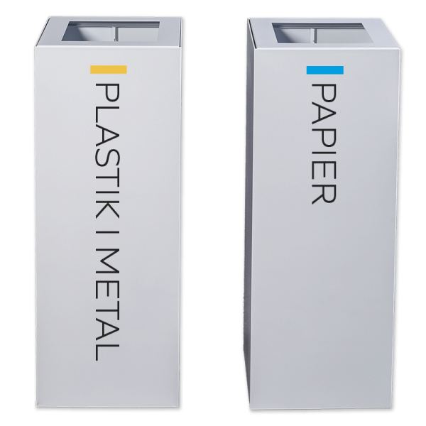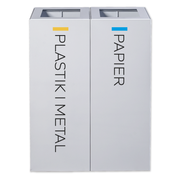Dostępny w naszej ofercie kosz na śmieci z segregacją jest zaprojektowany z myślą o selektywnej zbiórce odpadów. Posiada 2 komory, które można oznaczyć zgodnie ze standardowymi kolorami frakcji. Klient wraz z koszem otrzymuje zestaw naklejek do samodzielnego przyklejenia. Może wybrać: czarny (na odpady zmieszane), żółty (na tworzywa sztuczne i metale), niebieski (na papier), brązowy (na odpady BIO) lub zielony (na szkło).