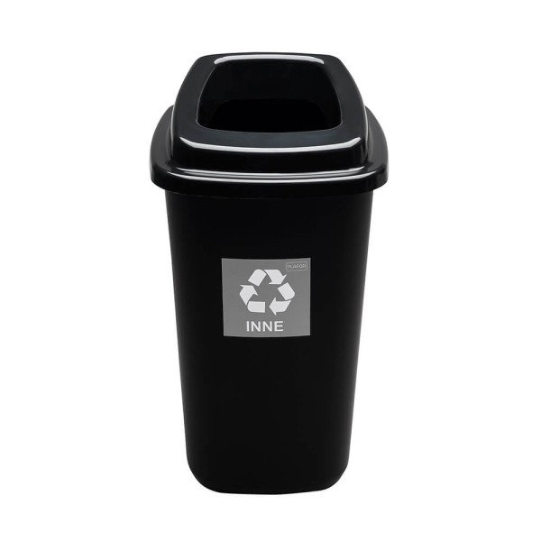 Kosz barwiony na czarno wyposażony jest w pokrywę z otworem, która umożliwia łatwe wyrzucanie odpadów. Segregację odpadów ułatwia naklejka funkcyjna, umieszczona na korpusie pojemnika.