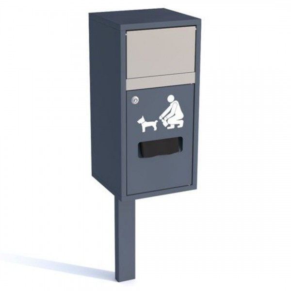 Pojemnik na psie odchody występuje standardowo w kolorze grafitowym (RAL 7021), ale jest dostępny również w innych kolorach z palety RAL. Posiada wrzut z klapą ze stali nierdzewnej oraz podajnik na worki na odchody. Zapewnia 2 sposoby montażu do podłoża.