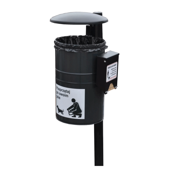 Dostępny w naszej ofercie kosz na psie odchody posiada rozwiązania zwiększające komfort jego użytkowania. Nad dużym pojemnikiem zamontowano praktyczny daszek, który chroni przed deszczem, wiatrem i ewentualnie zainteresowanymi zwierzętami. W standardzie dostępne są także podajnik na zestawy higieniczne (torebki biodegradowalne + łopatki kartonowe) lub uchwyt na jednorazowe rękawiczki czy worki.
