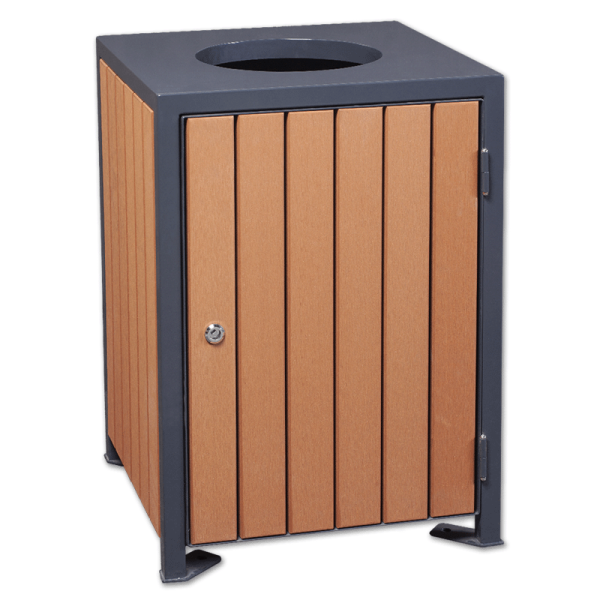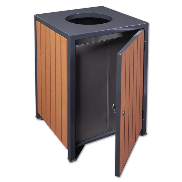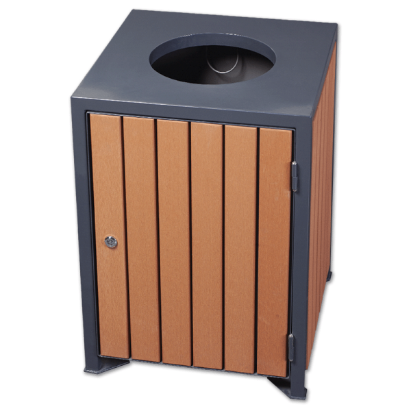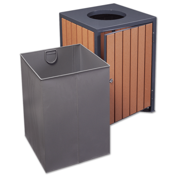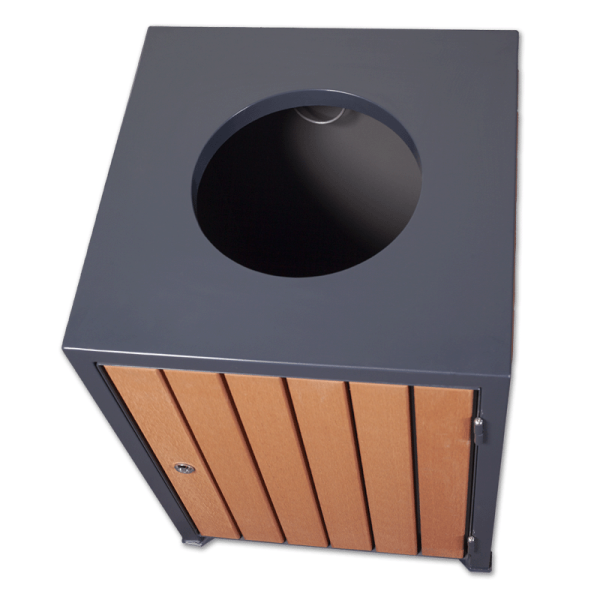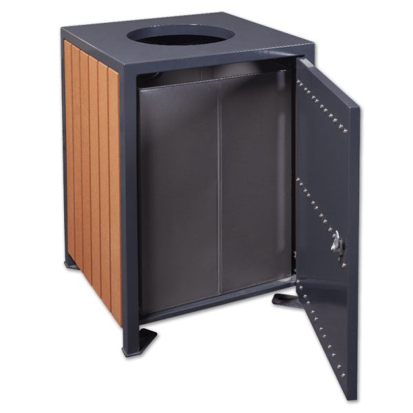Kosz miejski o pojemności 110 litrów ma elementy stalowe dostępne grafitowym kolorze (RAL 7016) i listwy z drewna kompozytowego (WPC) w kolorze drewna piniowego. Daje możliwość przykręcenia do podłoża. Jakość produktu potwierdzają przyznane certyfikaty ISO, BV i TUV.