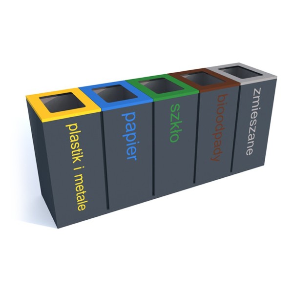 Kosz na śmieci Harmonics Color 5 x 100 L wykonany został ze stali ocynkowanej i malowanej, co zapewnia najwyższą jakość produkt. Do produkcji tego pojemnika na odpady użyto blachy o grubości 1 mm, dzięki której produkt jest stabilną konstrukcją. Każdy z modułów kosza na śmieci może zostać wykonany w kolorze odpowiadającym danej frakcji segregowanych w niej odpadów lub w wersji, w której jedynie otwór wrzutowy posiada oznaczenie kolorystyczne. Kolorystyka pojemnika na odpady wykonana jest zgodnie ze standardami wyznaczonymi przez Ministerstwo Środowiska. Prosimy o wybór kolorów modułów spośród podanych poniżej: