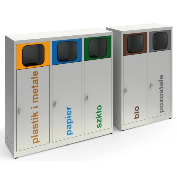 Kolor odpowiedniej segregacji zawarty jest na otworze wrzutowym pojemnika na śmieci. Dużym ułatwieniem są napisy odpowiadające danej frakcji w odpowiednim kolorze znajdujące się na drzwiczkach każdego modułu. Oznaczenia poszczególnych frakcji wysyłamy osobno - Klient może samodzielnie zdecydować o ich montażu w odniesieniu do swoich potrzeb. Korpus pojemnika do segregacji odpadów może zostać wykonany zarówno w kolorze grafitowym, jak i jasnoszarym co czyni go wyjątkowo eleganckim.
